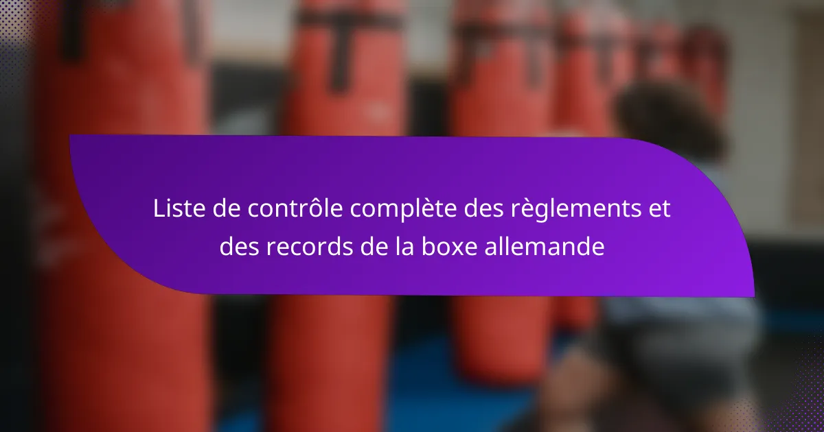 Cette liste de contrôle complète décrit les principales réglementations et enregistrements régissant la boxe en Allemagne, tels qu’établis par la Fédération Allemande de Boxe (BDB). Elle aborde des aspects essentiels tels que la délivrance de licences, les normes médicales et les protocoles de sécurité, tout en détaillant comment les enregistrements de boxe sont maintenus pour garantir la transparence et l’exactitude dans le suivi des performances des boxeurs.