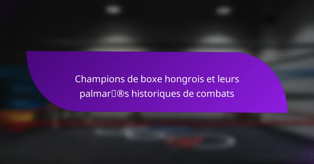 Les records de combats des champions de boxe hongrois incluent généralement le nombre total de combats, les victoires, les défaites et les KO. Les champions ont souvent des records qui montrent leur domination sur le ring, beaucoup atteignant des taux de victoire supérieurs à 50 %. Les statistiques peuvent varier considérablement en fonction de l’époque et de la catégorie de poids.